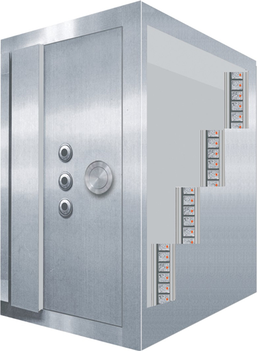 庫體墻板厚度分別為90、120、240mm,外殼用優(yōu)質(zhì)不銹鋼板材制造,內(nèi)由網(wǎng)格狀鋼板、鋼筋和混凝土組成,具備防搬、防撞擊、防切割、防火、防鉆等功能。