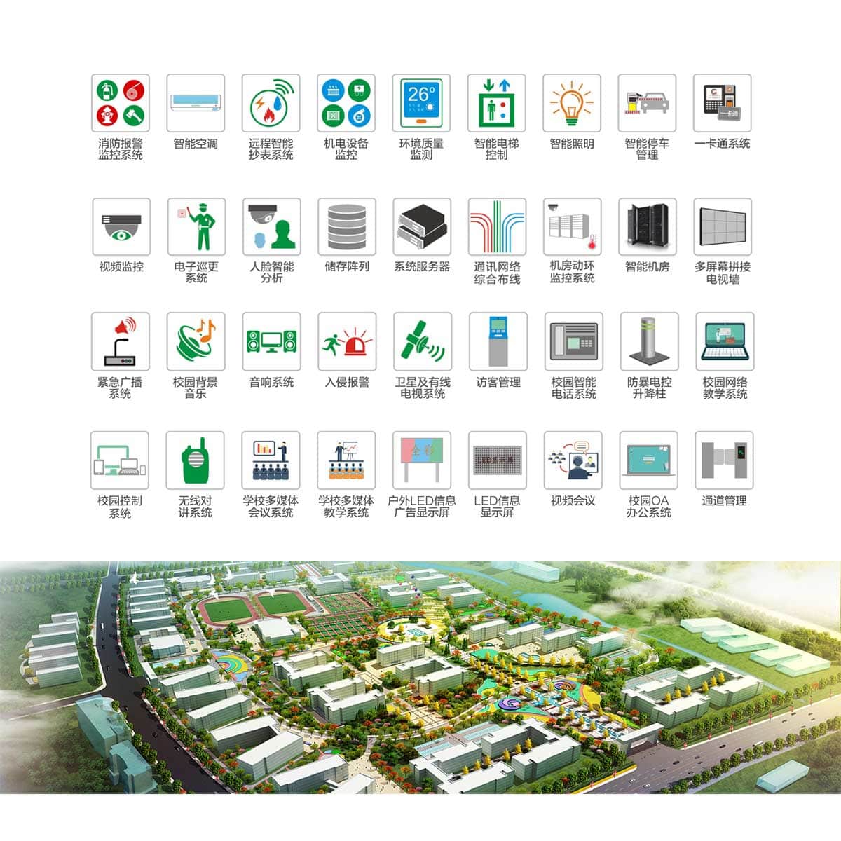 【智能化校園安全保障體系】如:校園監(jiān)控報警系統(tǒng)、電子巡更系統(tǒng)、門禁管理子系統(tǒng)、機房設(shè)備監(jiān)控系統(tǒng)等。